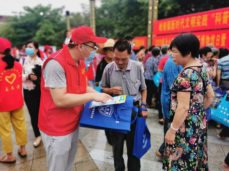 图为工作人员向群众发放信访宣传资料