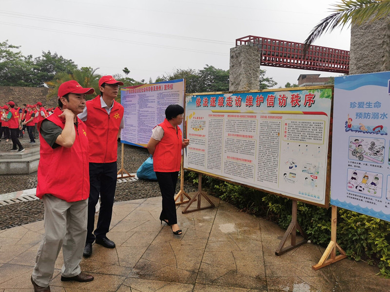图为合山市书记莫莲、市长徐钊和志愿者一起观看依法逐级走访宣传展板