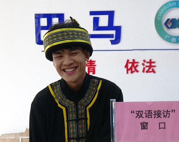 巴马瑶族自治县信访局群众接访服务大厅瑶族干部李大利,自2020年11月参加工作以来,就在“双语接访”窗口服务少数民族来访群众。对待来访的少数民族群众,他总是面带笑容用当地语言与之交流沟通,倾听他们的诉求,并做到有求必应,对维护少数民族地区的和谐稳定起到积极作用。