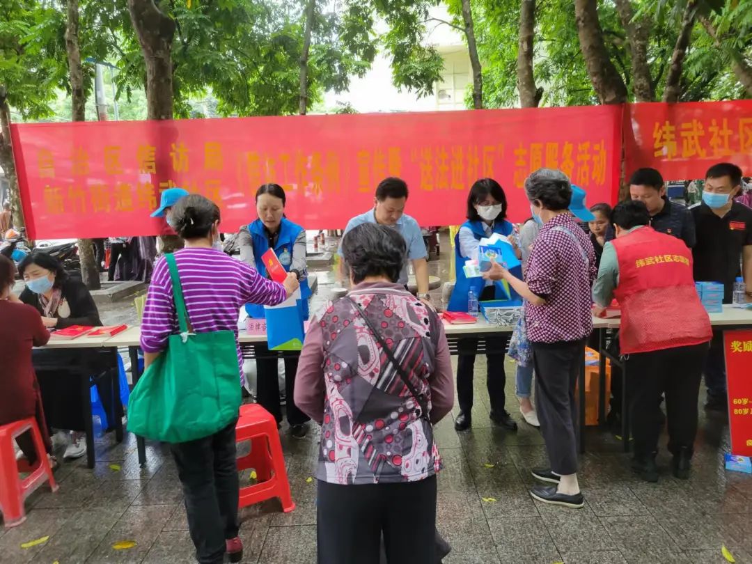 广西各级各部门积极推进《信访工作条例》“五进”,采取多种形式广泛宣传新颁布实施的《条例》,积极营造办事依法、遇事找法、解决问题用法、化解矛盾靠法的良好环境。图为广西壮族自治区信访局工作人员到南宁市青秀区新竹街道纬武社区开展宣传活动。
