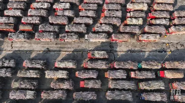 △来宾东糖凤凰有限公司内的甘蔗原料停放区。(总台央视记者范凯拍摄)